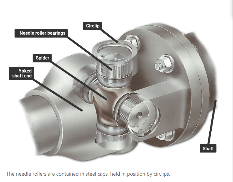 Universal joint consists of spider(cross) and 4 grease-filled roller bearings. It can transmit large torque at low friction. Spider with journal pegs and bearing cases as outer ring were hot forged or cold formed and machined.They are later carburized in furnace so that increased ruggedness and wear resistance are obtained.